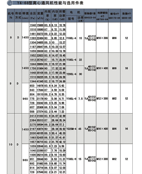 此两系列风机均制成单吸式,各有№8-16共7个机号,每种风机的出风角度又可制成0o、45o、90o、135o、180o、225o共六种,其传动方式为D式,电动机与风机联接采用弹性联轴器直接传动。
